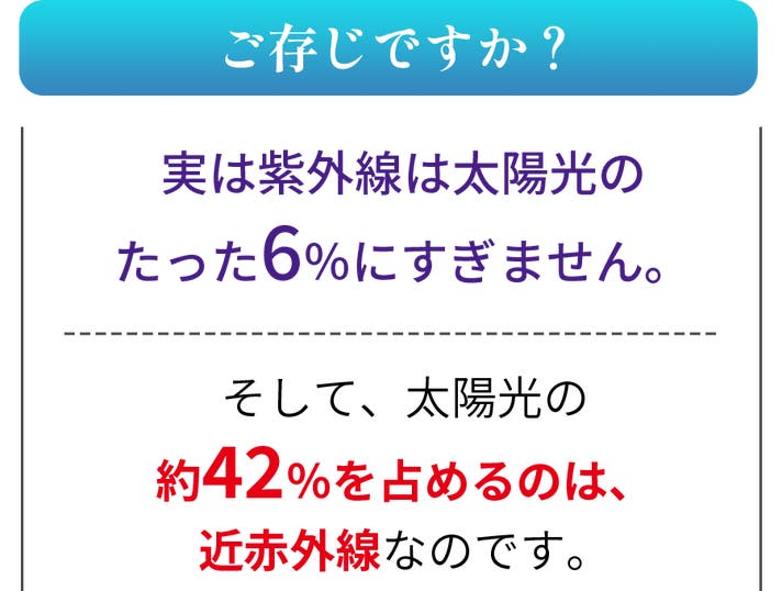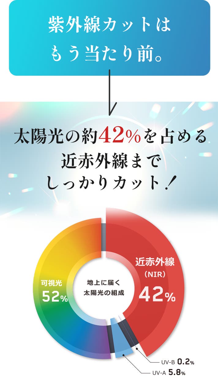 CWO®の特性を活かして原材料を生地に混ぜて作ってある為、生地単独で遮熱・遮光が可能になり裏地が黒でないため顔にハイトーン効果が見込める。紫外線が太陽光に占める割合はわずか6%程度なのに対して、約42%を占めるのが近赤外線です。