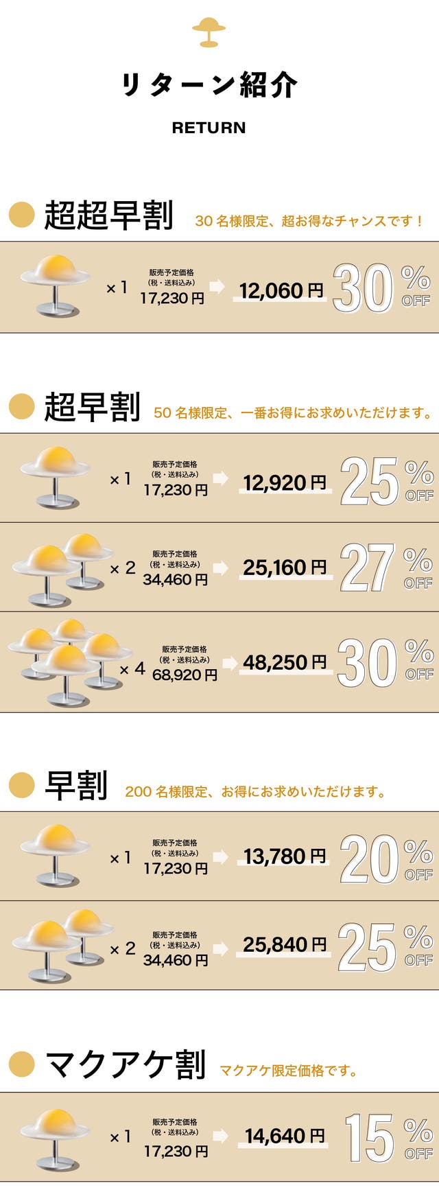 ※皆様の応援購入により量産効率が向上した場合、正規販売価格が販売予定価格より下がる可能性もございます。