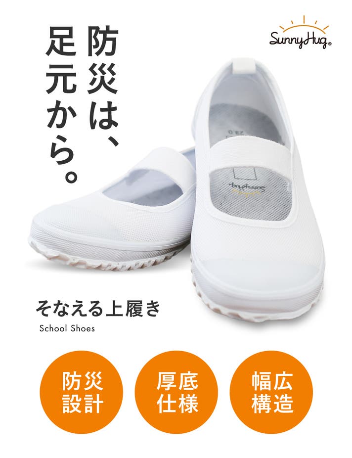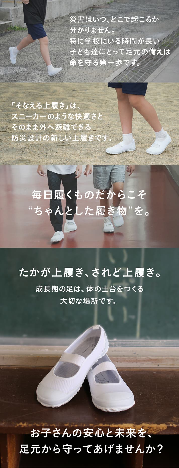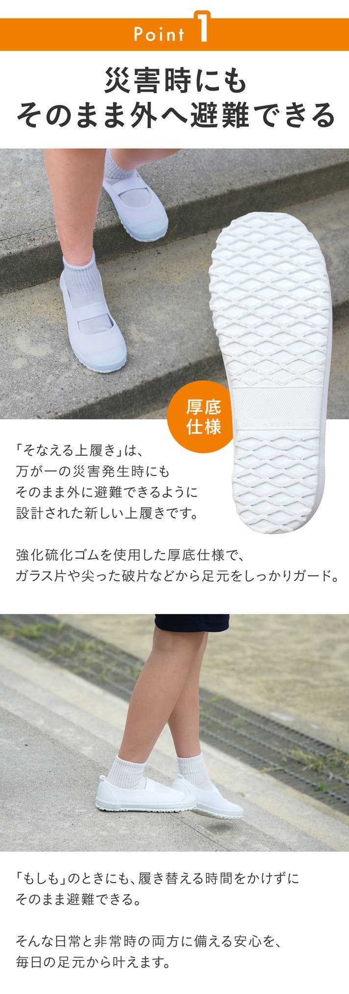 - “もしも”の時に備える上履き。スニーカーのような履き心地で、日常も災害時も子どもの足を守ります