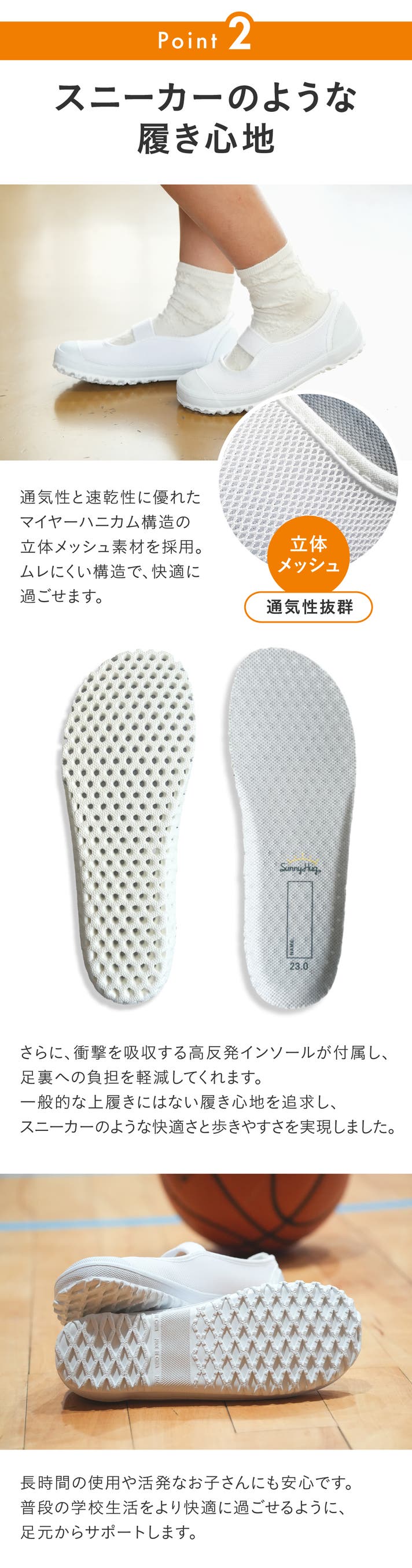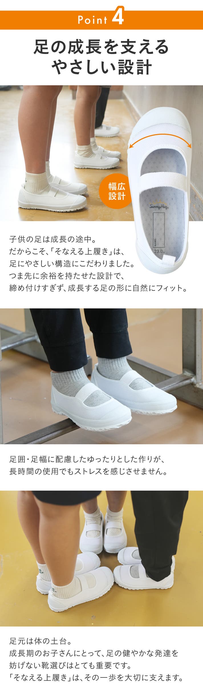 - 成長期の足にやさしく快適。幅広でつま先にゆとりを。長時間履いても足に負担をかけにくい設計です