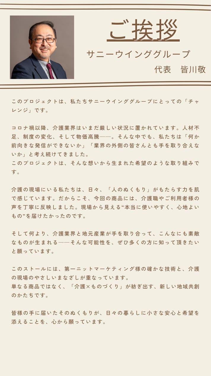 さらに、このような異業種による新たな取り組みは、地元産業の活性化にわずかでも貢献したいとの思いも込められており、高齢化が進む地域において、伝統産業であるニット産業が我々介護事業の会社とコラボレーションすることで、雇用の創出や技術の継承など様々な効果を生み、さらには介護事業との連携を通じて、地域社会全体に新たな活力を生み出す可能性を秘めているんではないかと期待しています。