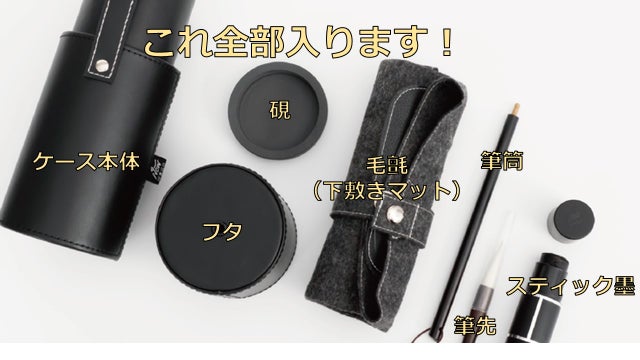 ケースをあけて、硯(すずり)、筆、スティック墨を取り出して、筆を組み立てるだけ。