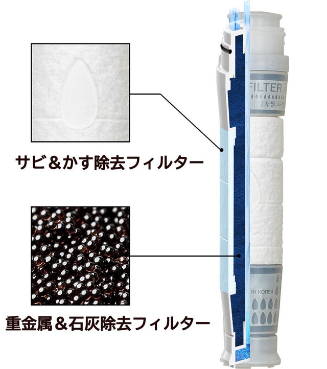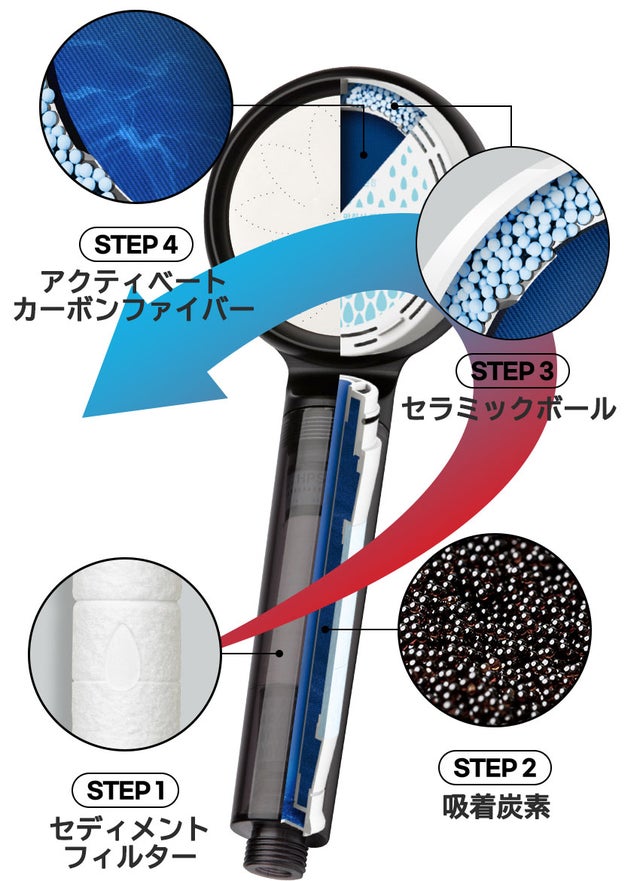 Step1. 粒子物質の除去 ▶ Step2. 重金属の除去、石灰成分の除去、軟水作用▶Step3. 塩素除去▶Step4. 水質改善