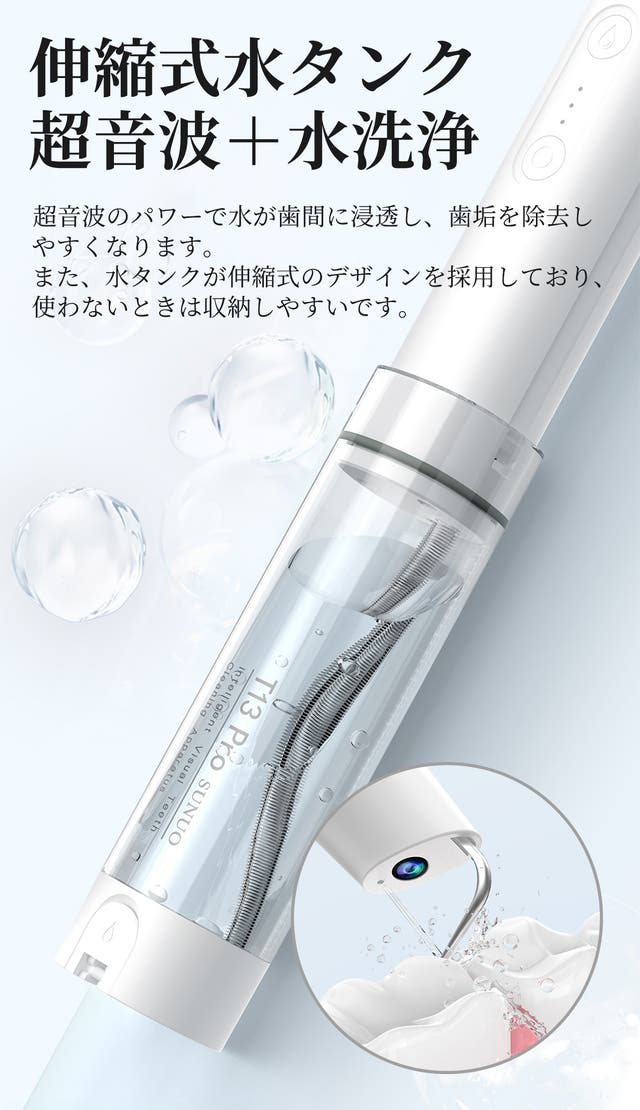 - 伸縮式水タンク付き、超音波洗浄しながらリンスできるのでスースー感!歯垢の残留を防ぐ