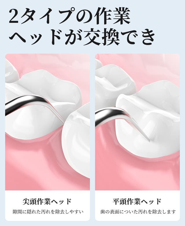 隙間に使う尖頭作業ヘッドと歯の表面に使う平頭作業ヘッドを用意しており、死角なく全方向に歯を洗浄します。