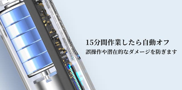 - 2タイプの作業ヘッドが交換でき、歯茎に触れると自動ストップ&15分間自動オフ。安全で簡単操作