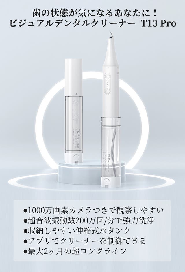 日本は歯の問題が多い国と言われています。歯のトラブルを防ぐために、定期的に歯科クリニックで歯石の除去や歯の表面の清掃をしてもらうことはもちろん、日々の口腔衛生も重要ですので、歯の健康を守るためにも、SUNUO のビジュアルデンタルクリーナー T13 Pro をご提供させていただきます。