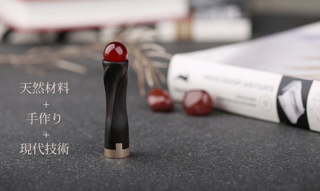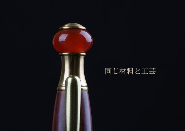 上部にあしらった赤いメノウの玉は天と神を表し、手作業で螺旋状に磨かれた持ち手部分の紫檀は、天と地を結ぶ人の世界を表しています。