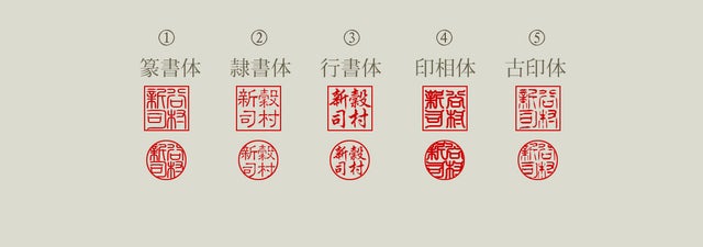 下記の5種類のフォントは彫刻の選択として使えます。角印は9文字、丸印は4文字以内に収まるようにお願いします。