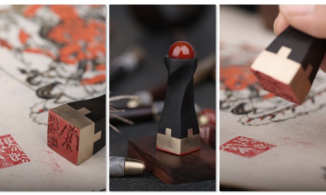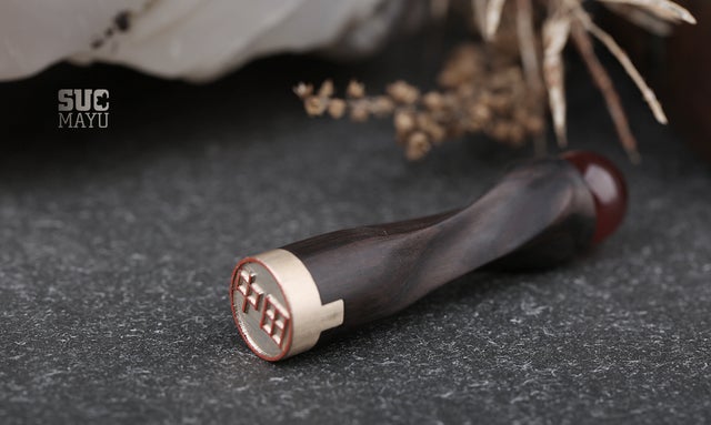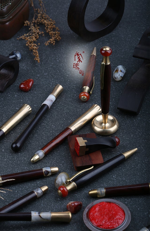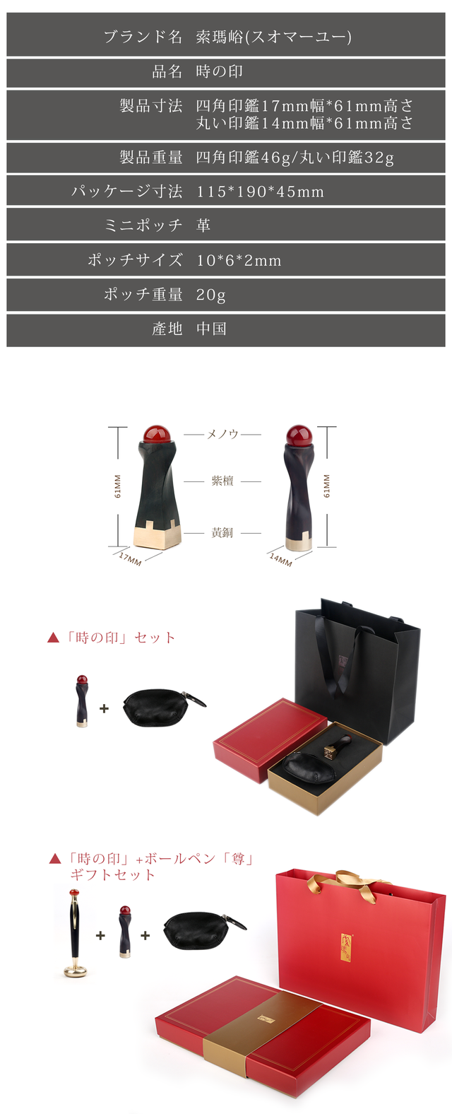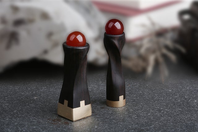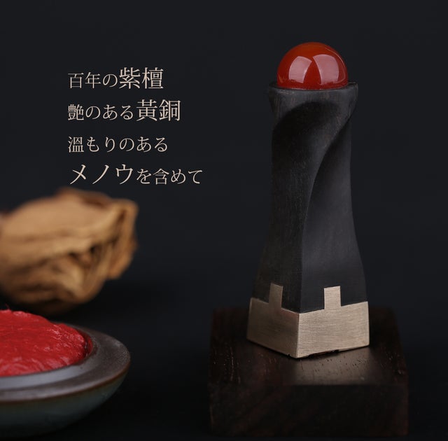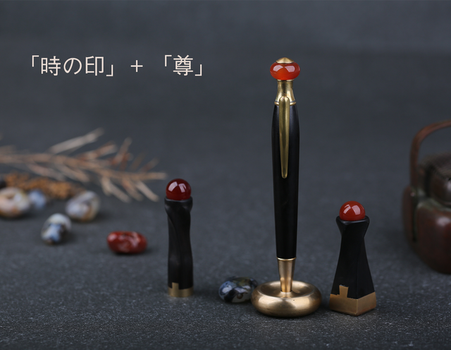 「時の印」は、貴重な天然材料であるメノウと紫檀、そして黄銅を使用しています。