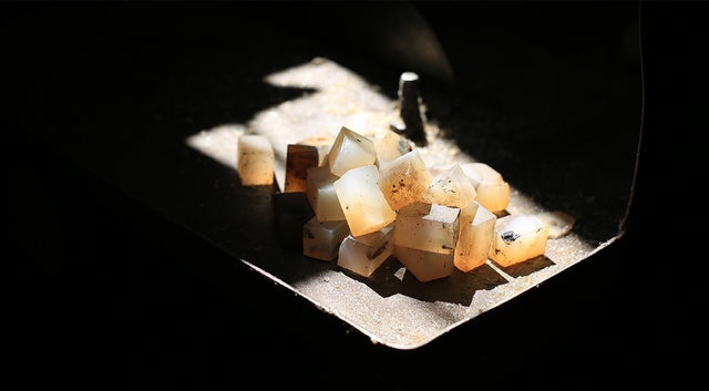 また、メノウと紫檀は天然の材料であるため、元々穴があったり、加工時に破損したりすることが多く、完成品として使用できるものはごく一部しかありません。