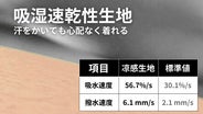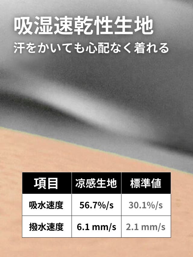 吸湿速乾技術を備えた生地を使用し、汗をかいても心配なくすっきりと着られます。この特殊な構造により、汗を素早く吸収し、表面に拡散させて迅速に蒸発させます。