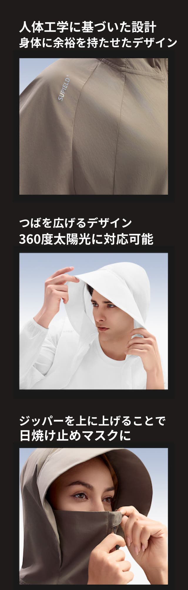 ツバ付きフードは、肌の露出を最小限に抑えて紫外線から肌や髪を守ります。フードをかぶれば首元や頭部の日焼け防止に役立ちます。フード後部には、女性が髪を結んだままで違和感なくかぶれるスリットデザインも便利です。