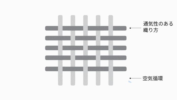 開放感のある織り方「トロピカル組織」を採用。風が抜けるような爽やかな着用感で、蒸し暑い日も快適。エアコンの風も通すほどの高通気性を実現し、日本の気候にぴったりです。