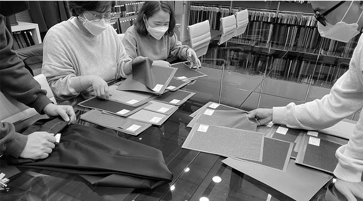 大量の素材サンプルを揃え、見た目・肌触り・機能性を追求。