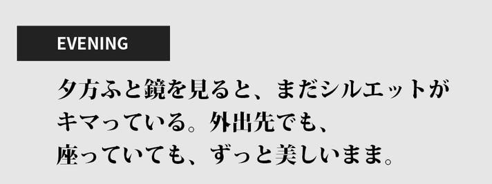 見た目はすっきりキレイなまま、ウエストがやさしくフィット。食後や長時間のデスクワークでも、ラクに過ごせます。