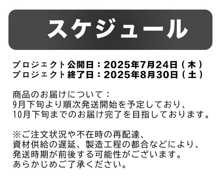 このプロジェクトはAll in型です。目標金額の達成に関わらず、プロジェクト終了日の2025年08月30日までに支払いを完了した時点で購入が成立します。