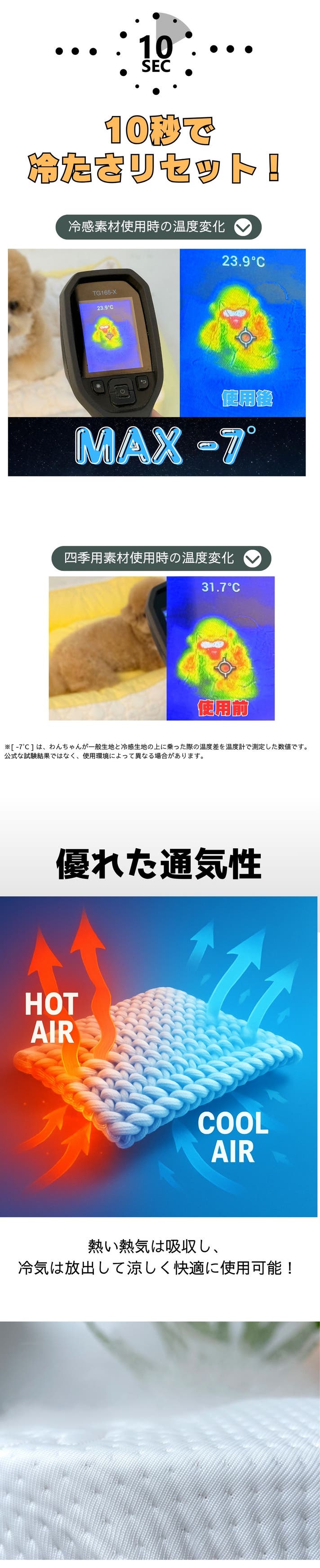 - 10秒だけで表面温度-7℃! 触れた瞬間、ひんやり!特殊な冷感素材使用!