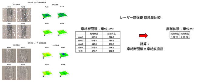 CMS製のトライボメータとレーザー顕微鏡の表面形状測定で試験を行い、この試験では未施工と比較して2倍の耐傷性の向上「Super Rich施工済みサンプルの耐久性は未施工サンプルに対して約2倍傷つきにくくなっています。」