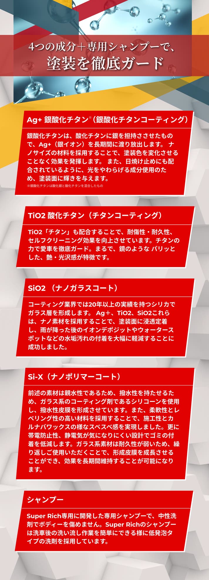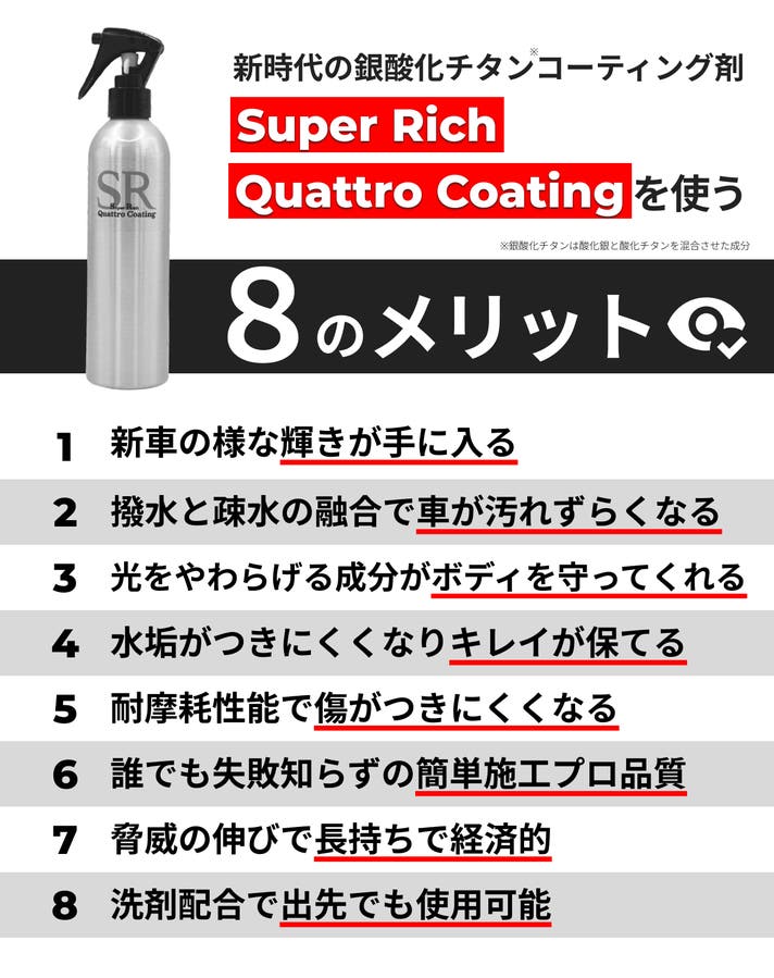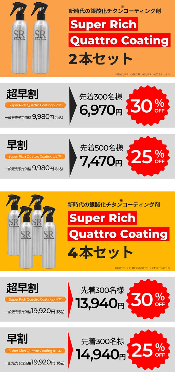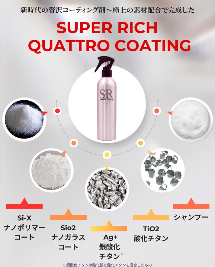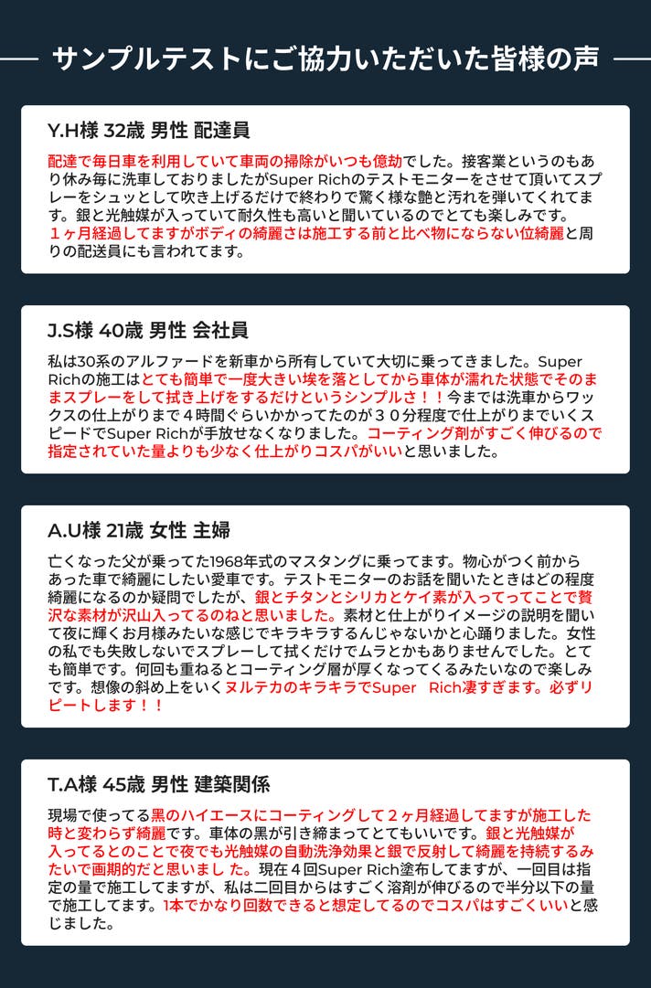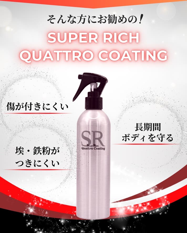 Super Rich Quattro Coatingは次世代のオールインワンコーティング剤の一角を担うと自負しておりSuper Richには自信しかありませんのでお手に取り是非お試し下さい。
