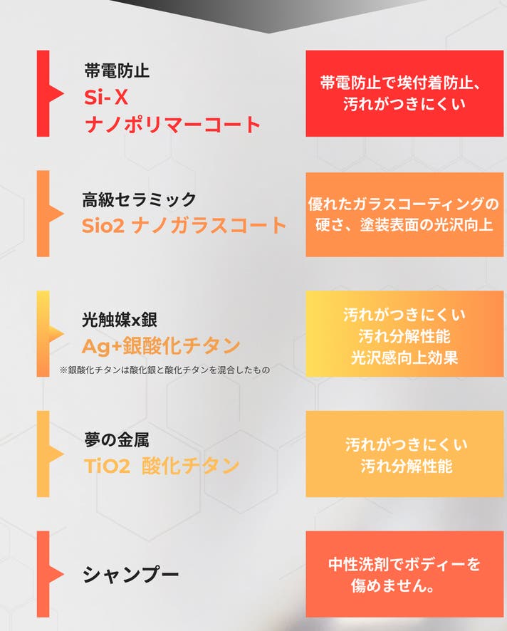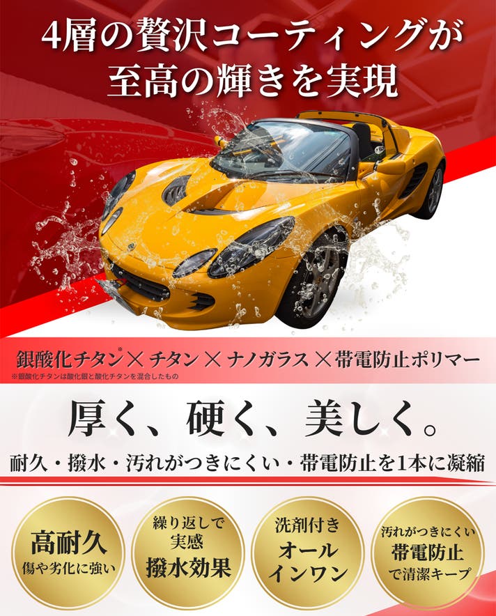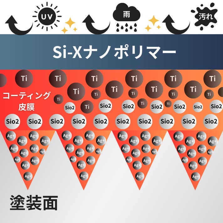A.銀酸化チタン※、チタン、ガラスコーティングは1回の施工長時間持続します。ポリマーコーティングは継続継続的にすると持続期間が長くなり、徐々に管理が楽になります。※実際の使用状況や車種の状態によって異なります。※銀酸化チタンは酸化銀と酸化チタンを混合したもの