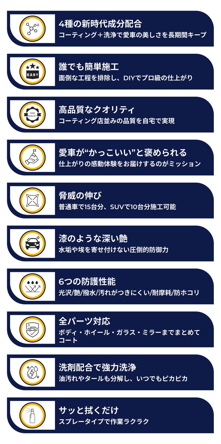 - 繰り返し使用することでコーティング被膜に厚みと深みが増し、より高い状態でのパフォーマンスを持続