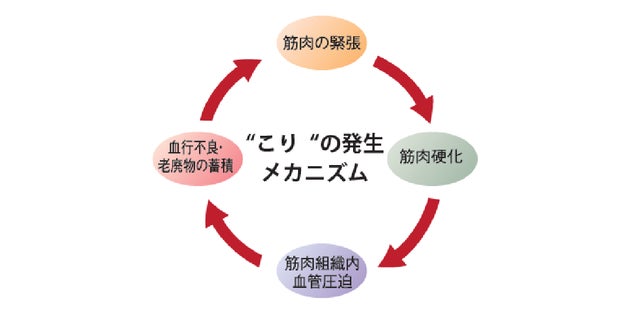 一般的には、筋肉が緊張した状態が「こり」と呼ばれていますが、実際には下の図のようなサイクル全体のことを言います。そしてこのサイクルが緊迫することによって不快感が増し、「こり」を感じるようになります。