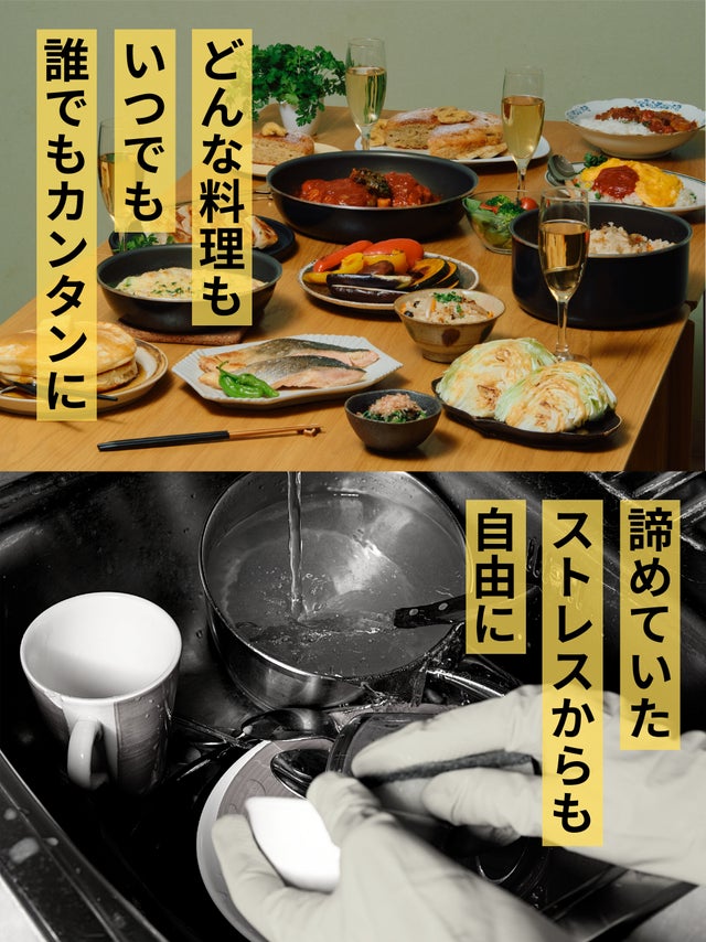柔らかいスポンジと中性洗剤だけで、面倒なフライパン洗いが、まるで「お皿を洗うかのような手軽さ」になります。