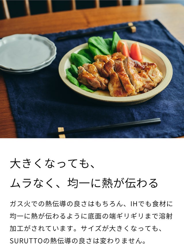 一般的なIH/ガス対応フライパンは底面に異なる素材を無理矢理貼り合わせているのに対し、SURUTTOは溶射加工のおかげで熱変形が起こりにくいのが特徴です。