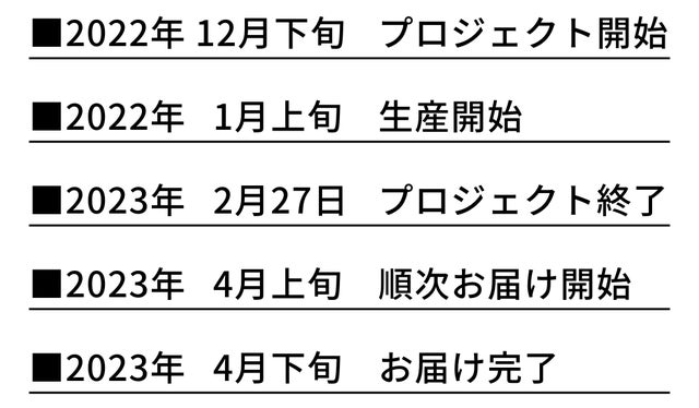 ※皆様の応援購入により量産効率が向上した場合、正規販売価格が販売予定価格より下がる可能性もございます。