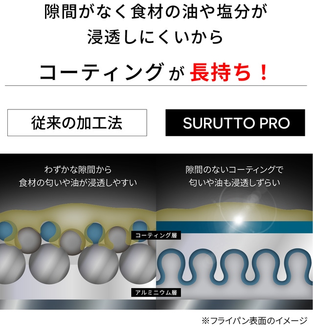 - 多くのコーティングフライパンが抱えていた「ある限界」を、SURUTTO PROが突破した!