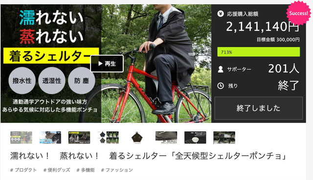 2020年9月にMakuakeでデビューした第1弾「全天候型シェルターポンチョ」プロジェクトは、200名以上の方から目標額を大幅に超えるご支援をいただくことができました。