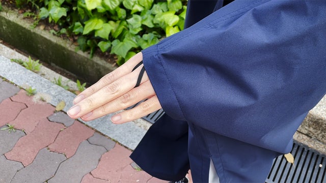 袖口部分にゴムのループを装着。指を通すことで袖のズリ上がりを防いでくれます。