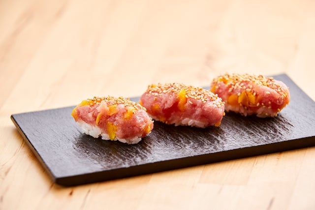 1番人気のトロタクは海苔は使わずトロの脂と沢庵の食感を味わって頂けます。