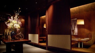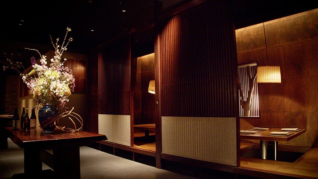圧巻の1枚板のカウンターと鎌倉彫で仕立て上げた内装は重厚感がございます。
