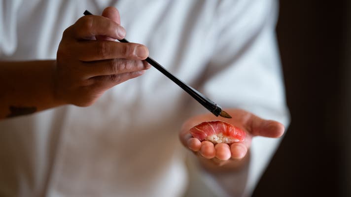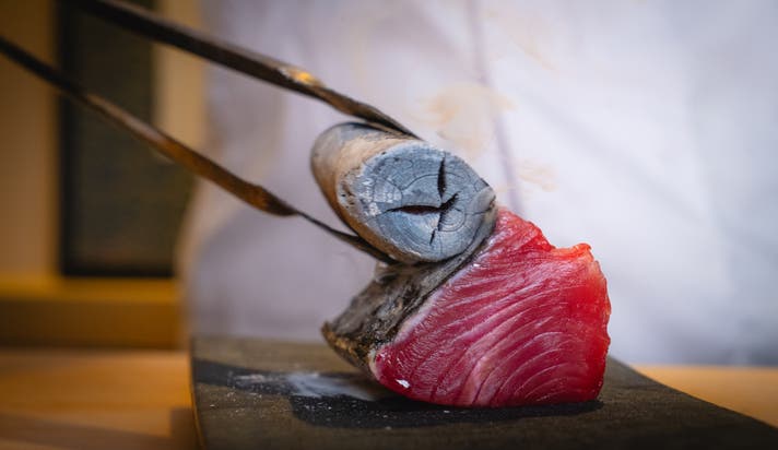 大将は和食歴18年、魚のプロフェッショナルでソムリエ資格を持つ。江戸前の技法(寝かせ・締め・火入れ)を軸に、砂糖不使用の白シャリでネタの輪郭を際立たせ、ワインの酸・ミネラル・果実味と響き合うコースを設計します。「鮨とワインの両方を熟知した大将ならではのペアリング」が当店の強み。