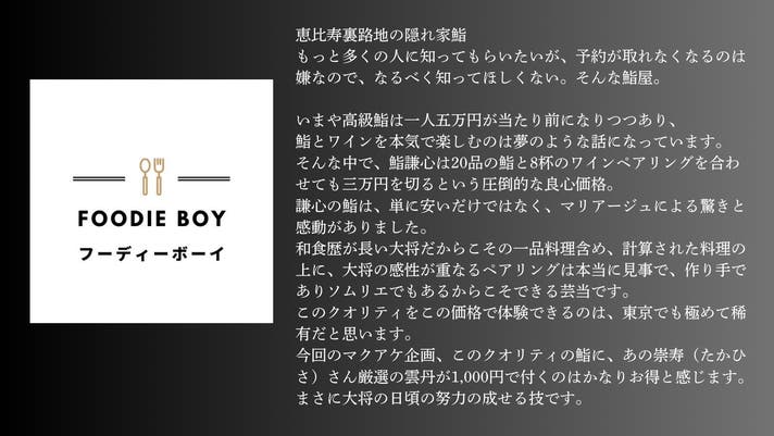 美食を追求する、Youtubeのチャンネル登録者数18.3万人のフーディーボーイさんもこう標している。
