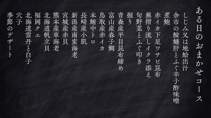 日曜日限定のオールインクルーシブコースは、普段のおまかせコースとは一味違う昆布締めや、熟成、野菜とのイノベティブ料理など日曜日限定コースをご提供いたします。