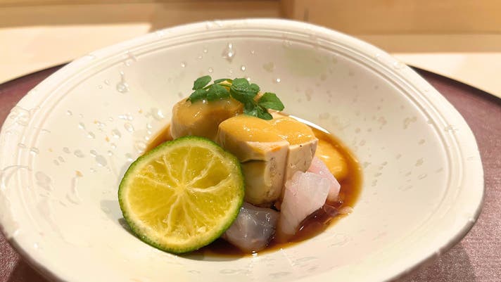 旬の食材を駆使した、和洋折衷の独自な鮨は、客を未知の美味しさへと誘います。