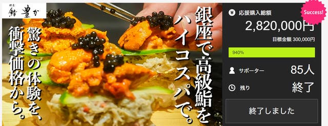23年7月、マクアケにて無名の新店ながら「応援購入総額:12,617,000円」「プロジェクト達成率:2523%」を達成した「鮨あきは」。