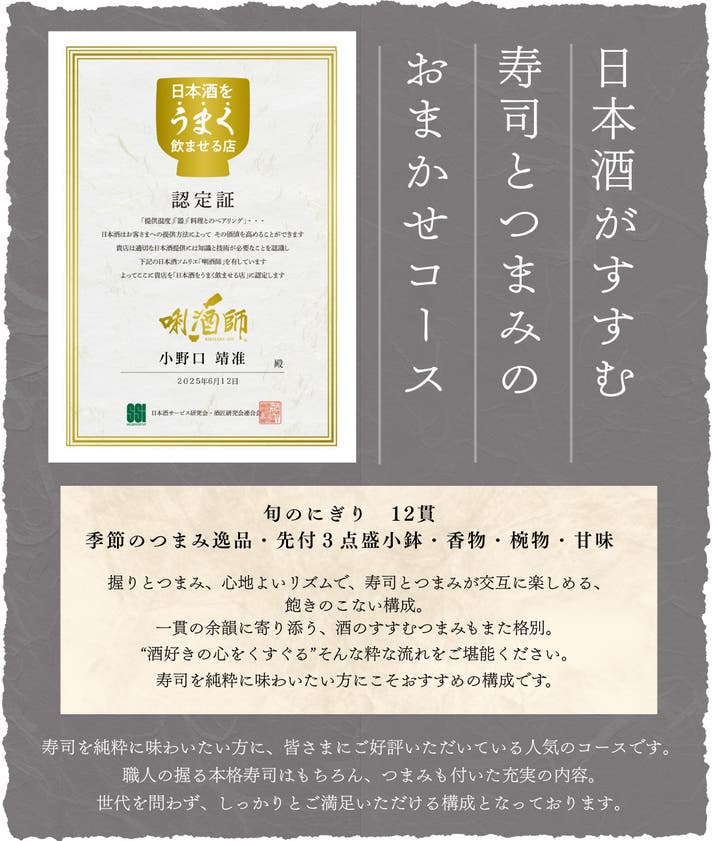寿司職人歴35年 × 利き酒師の他、日本酒ソムリエや料飲サービス検定など、サービスアテンドの資格も持つ大将が贈る、鮨と酒の極上マリアージュ。