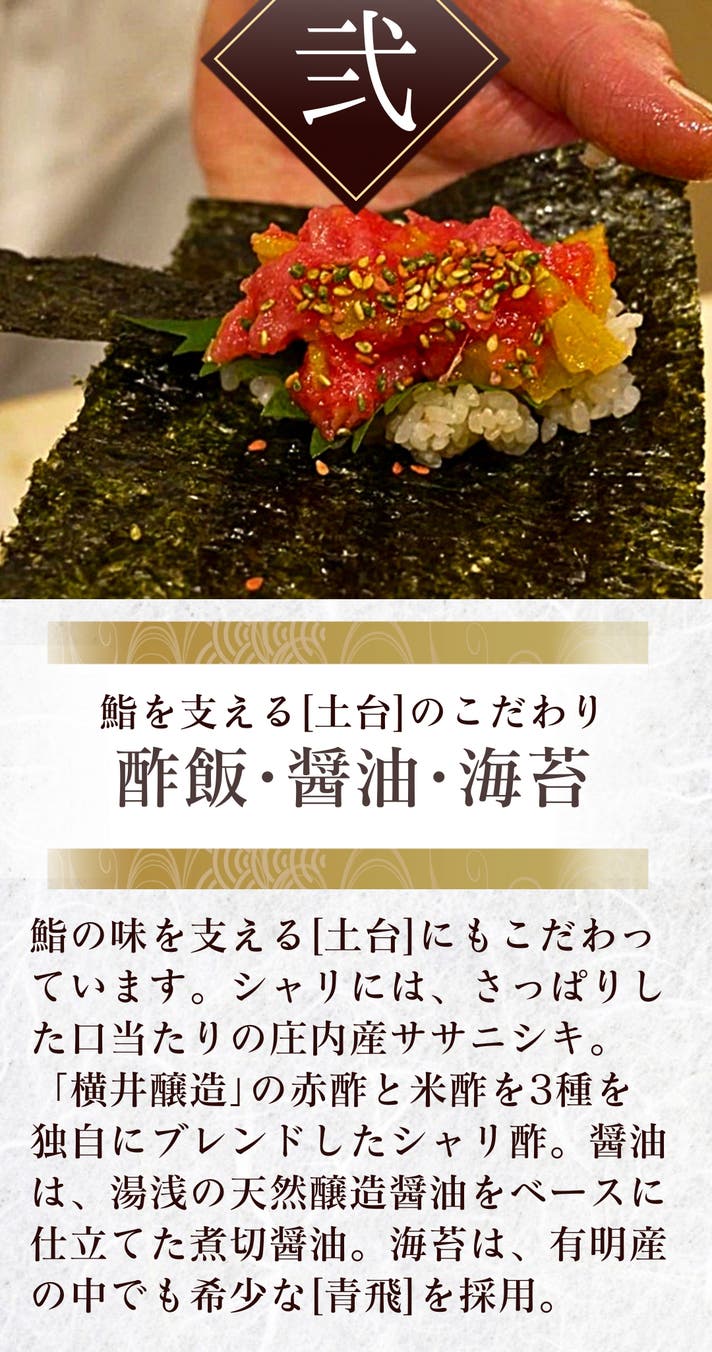 寿司を「五感の芸術体験」と捉え、一貫一貫に魂を込めて、食べる人の“記憶に残る時間”を追求している。