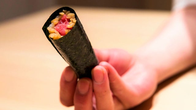 「突先(とっさき)」という希少な部位(マグロの頭の付け根部分)と酢飯を、有明産の最上級の海苔で巻いた手巻き鮨