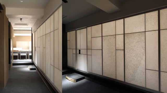 _弊店は、鮨激戦区である銀座6丁目に店をおきます。お客様をお迎えする店構えは、全体を黒基調にしダウンライトに照らしだされる白をあしらうことで凛とした空気を持たせつつも壁は漆喰・土壁にすることで、格調高くもどこかほっとする空間にこだわりました。