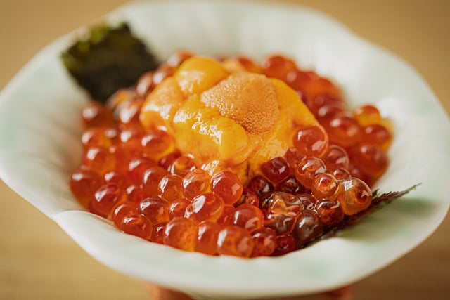 「ウニとイクラの小丼」は、自家製のイクラ醤油漬けの上に、旬のウニを重ねた丼。その時期に最も美味しいウニを選りすぐり、贅沢な逸品に仕立てます。