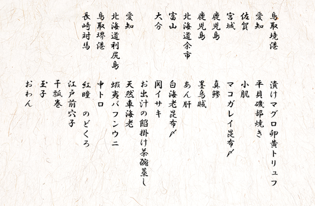- ネタの仕入れ先は三つ星の超有名店と同じ。名店に勝るとも劣らない江戸前鮨を適正価格でご提供。