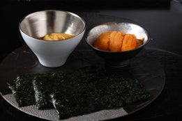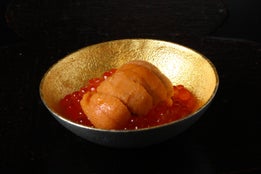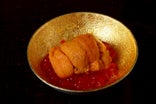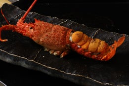 房総半島から仕入れる伊勢エビを8割の加減で蒸しあげ、生雲丹を乗せて炙り焼きにて仕上げます。雲丹と伊勢エビを絡めながら召し上がって頂きプリプリでありながらレア感を残したエビ身と濃厚ウニソースを御堪能ください。色合いと食欲をそそる香りもお愉しみ頂けます