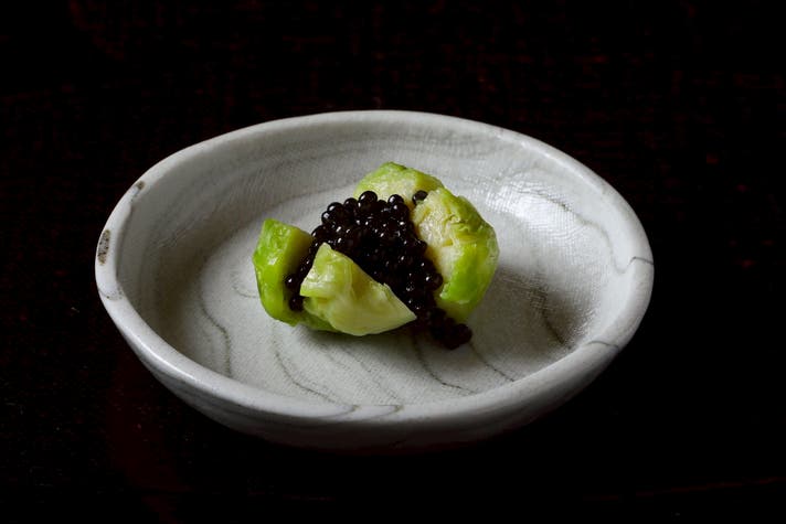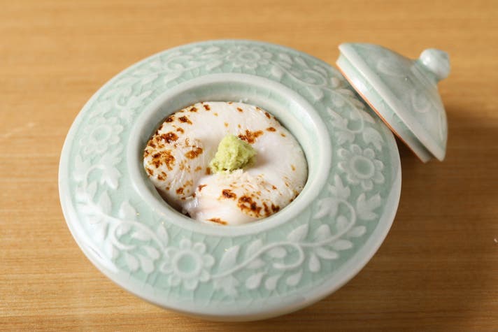 九州五島列島から直送した鰡の子を塩漬けし1週間天日に干して作る大将自慢のカラスミを鮨割烹久保では炙りと生の風味の違いをお楽しみ頂けます、少しずつ囓って最後まで残しておきたくなる一皿です