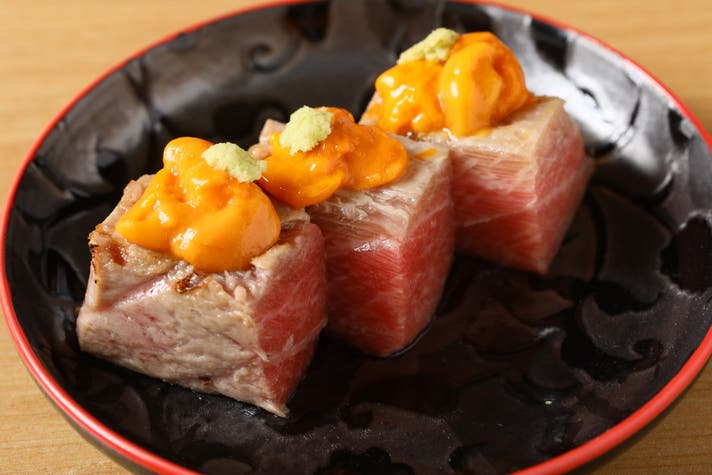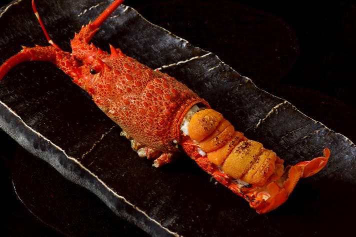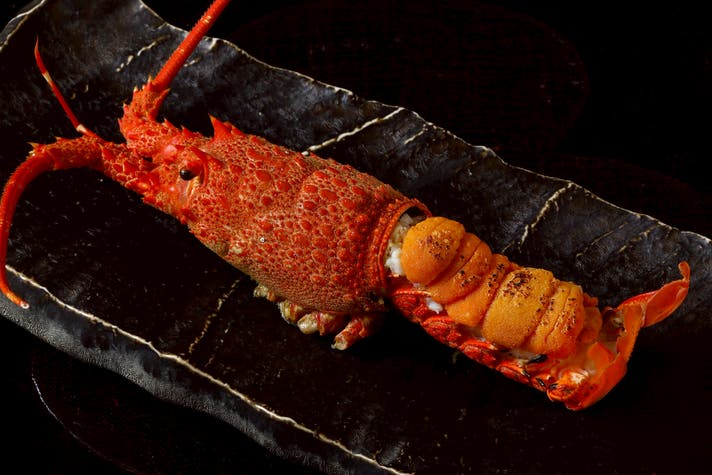 房総半島から仕入れる伊勢エビを8割の加減で蒸しあげ、生雲丹を乗せて炙り焼きにて仕上げます。雲丹と伊勢エビを絡めながら召し上がって頂きプリプリでありながらレア感を残したエビ身と濃厚ウニソースを御堪能ください。色合いと食欲をそそる香りもお愉しみ頂けます
