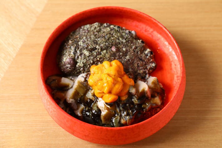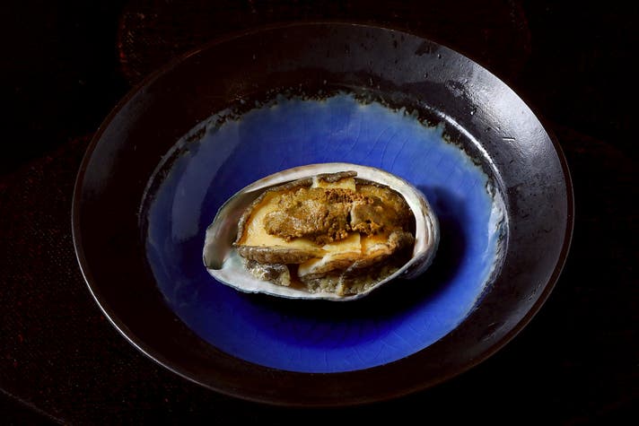 鮑は通常大根と一緒に炊いて柔らかくしますが、久保大将は長時間酒蒸しにすることで御年寄でも食べられる柔らかさに仕上げます、更に肝を使ったソースは洋も感じさせ寿司屋では出せない御料理です、鮑も三陸産の厳選した鮑を使用